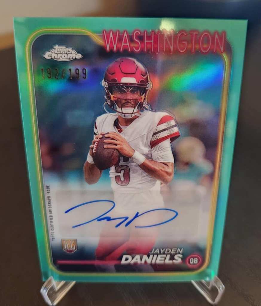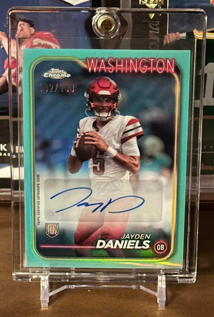 While I primarily collect Badger and Packer players (along with surefire hall of famers like Brady and Mahomes), I also make sure to have autos of all of the major QB rookies every year (which started after I passed on chasing Mahomes in 2017, which was a big mistake). Right now, we’re in a weird era where Panini has the right to make licensed NFL cards but Topps has the exclusive auto rights for a lot of the big rookies, especially the quarterbacks. As a consolation prize, we at least had Topps Chrome and Topps Finest release this year with autos of the major quarterbacks, and Topps did a decent job of making it obvious that they were unlicensed. This teal Jayden /199 is about as classic as you can get for a QB rookie auto, and has great eye appeal despite the lack of Commanders logos.