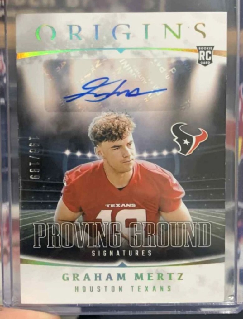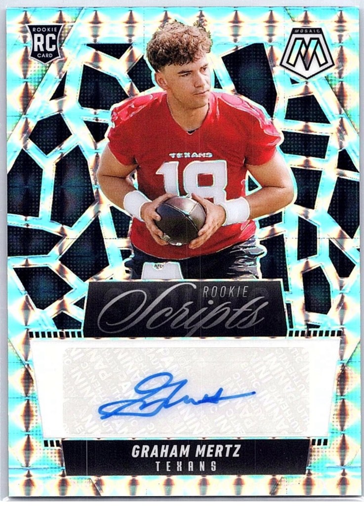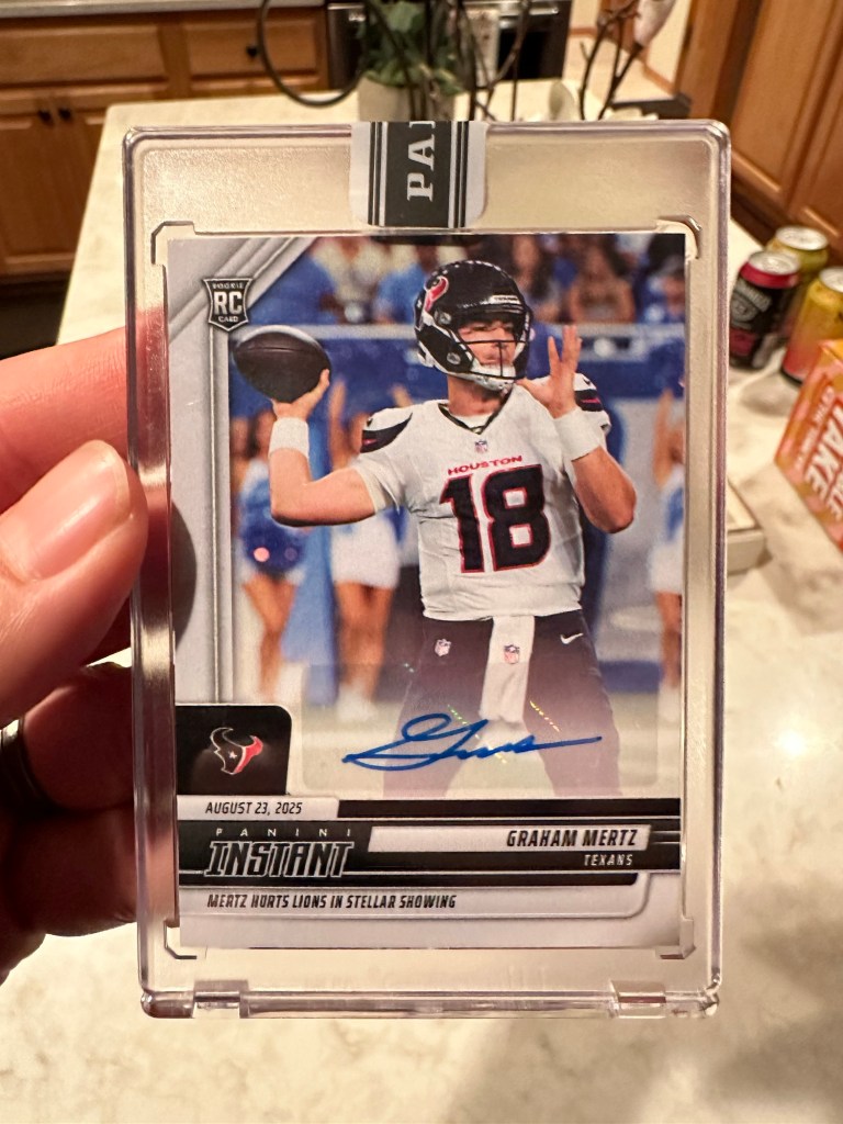 Since there are no Badger rookies this year to speak of (Hunter Wohler and Jack Nelson were both late round picks at positions unlikely to generate significant card interest), I’ve had to settle for chasing cards of Badgers who went elsewhere via the transfer portal. While Chimere Dike has had a surprising number of cards for an awful Titans team, the real chase has been our former quarterback Graham Mertz. Panini hasn’t used a lot of imagination with his photos (most of his autos have all used the same photo aside from Panini Instant), I’ve been able to put together a decently sized Mertz auto collection in his Texans uniform to compliment my collection of his autos in Badger and Gator uniforms.
