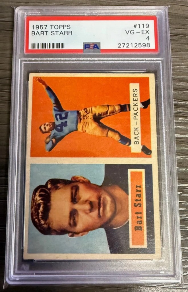 The first legendary Packer quarterback and the winner of the first two Super Bowls, modern Bart Starr cards (including plenty of autos that he signed prior to his death) can be found for less money than you might think for a player of his stature. However, his rookies command a pretty high price in any decent grade, especially when they have decent centering and eye appeal. This PSA 4 is the best of both worlds to me, with excellent centering and decent corners, edges, and surface for the grade.