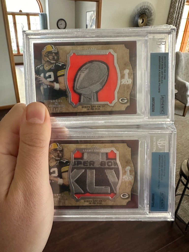 This is a true holy grail piece for a Packers fan: patches from one of the actual pylons used in Super Bowl 45! I had an eBay alert set for a different 2011 Five Star Rodgers card, and this set happened to pop up. Once I saw it, I knew that it had to be part of the collection!