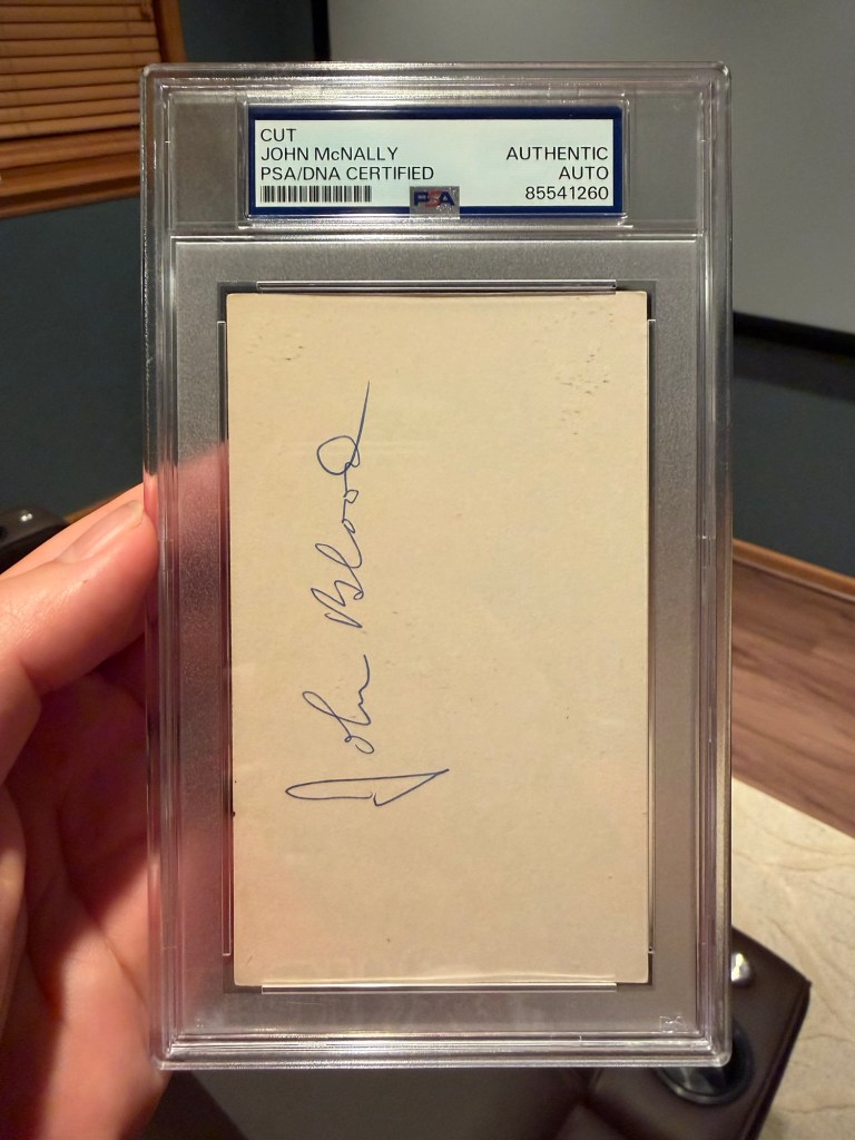 I’ve chronicled several other autos that I’ve picked up from the first couple decades of the league, with a focus on Packer legends and Hall of Fame quarterbacks. Johnny “Blood” McNally is one of the former. He was a halfback who won titles with Arnie Herber and Curly Lambeau, and whose exploits off the field are almost as legendary (there is an entire section on his Wikipedia page entitled “Legendary Antics”). This particular piece is truly unique: it’s a Kodak film sheet from 1948, with an address of the Senator Hotel. Research shows that the Senator Hotel was a famous institution in Atlantic City at the time, and this time also coincides with Johnny’s wedding and honeymoon with his first wife, so it’s very likely that this Kodak sheet was from getting pictures developed while on his honeymoon.
